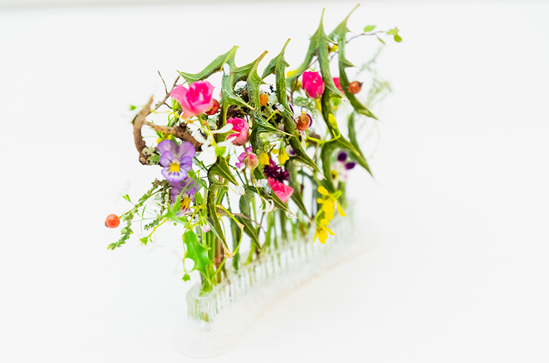 フラワーデザインで使用する花材としては小花が好きです。庭の花、山野草など、できるだけ自然界にあるものを使いたい。身近なものをどれだけ使えるかというのがフラワーデザイナーの資質の1つだと考えているので、身近な資源をどう活用するかというのは常に意識しています。これは多くのフラワーデザイナーに共通する考え方ではないでしょうか。
