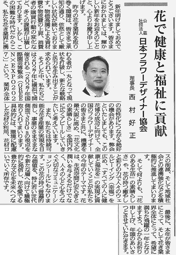 「花卉園芸新聞」(2025.8.1)にて、弊会定時総会の記事と、役員就任のご挨拶をご紹介いただきました。10面には、理事長・西村好正による暑中お見舞いのフラワーデザイン作品もご掲載いただきました。
