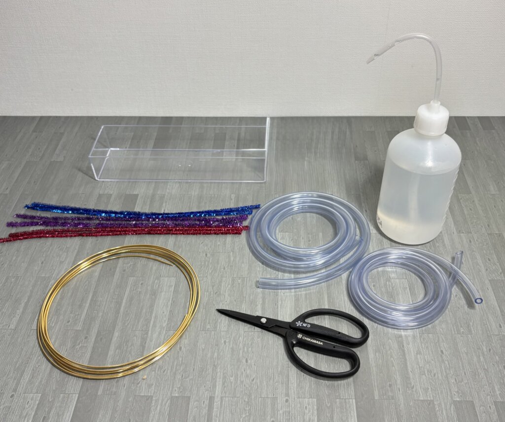 アルミワイヤ、クリアボックス、モール、スポイトボトル、ビニールチューブ(ホームセンタにて購入。9㎜/7㎜サイズを使用)、ハサミ(ワイヤーの切れるもの)