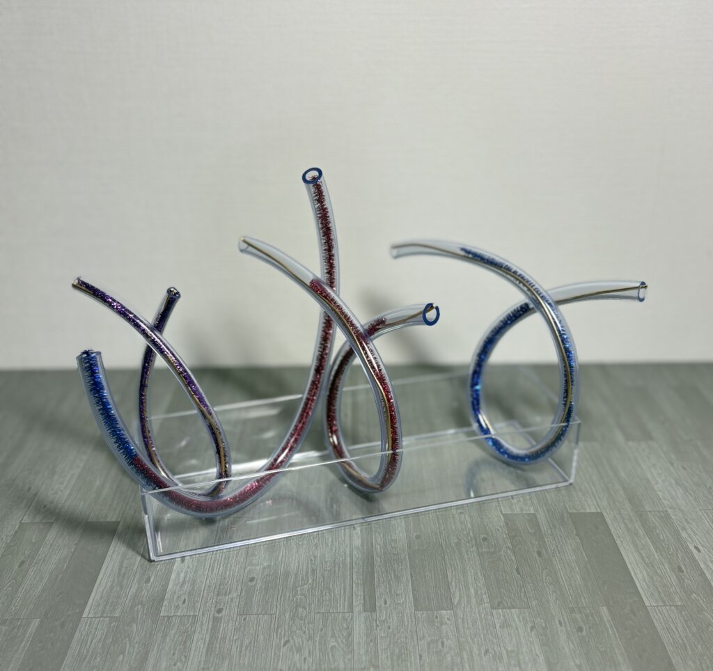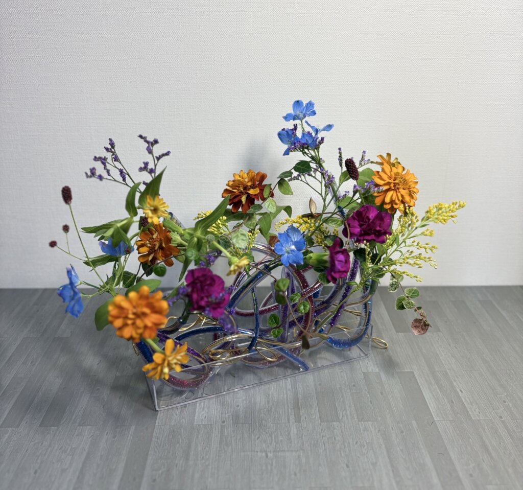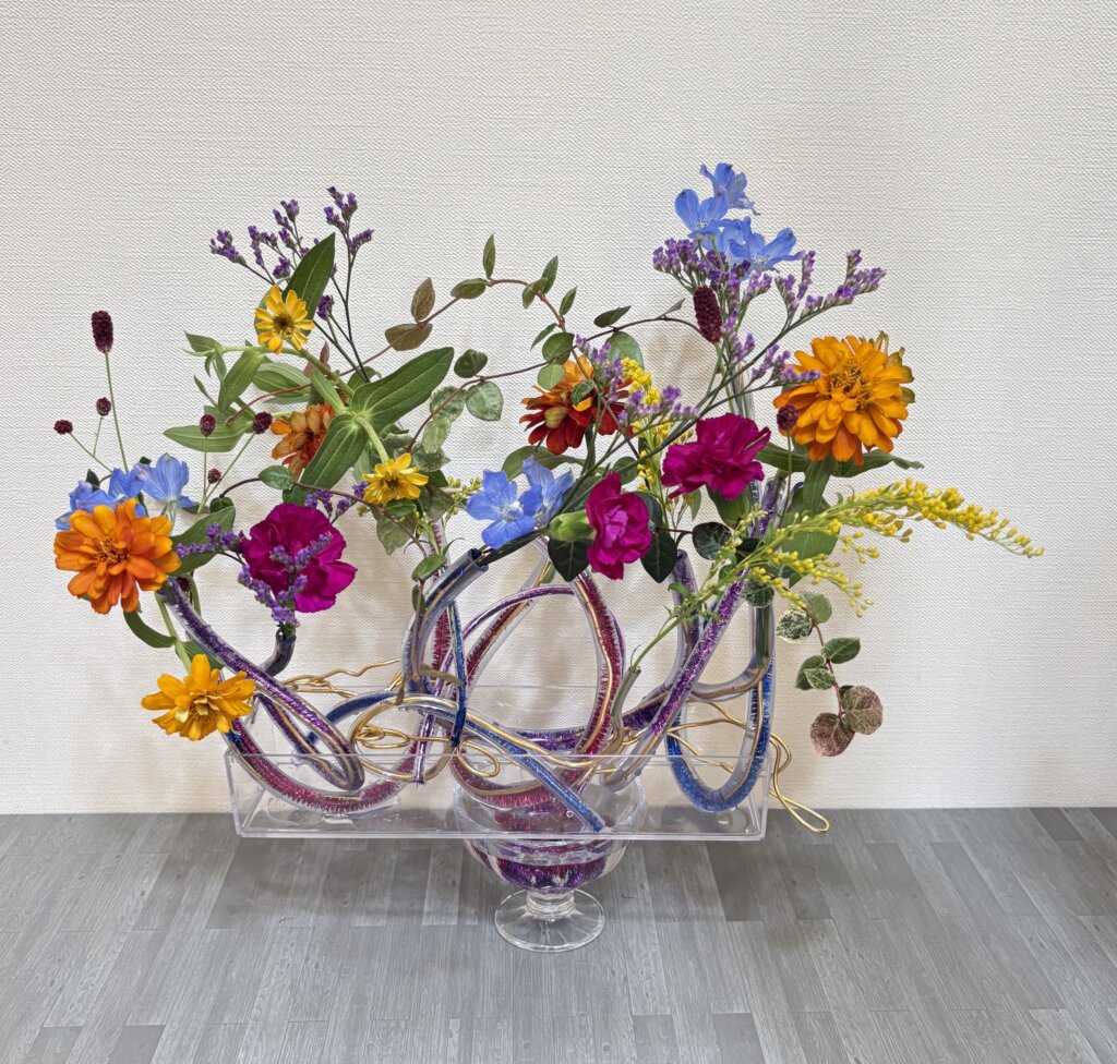 人工的なチューブは花留めとしてだけでなく、その動きや質感が花と同等に作品の重要な要素になります。