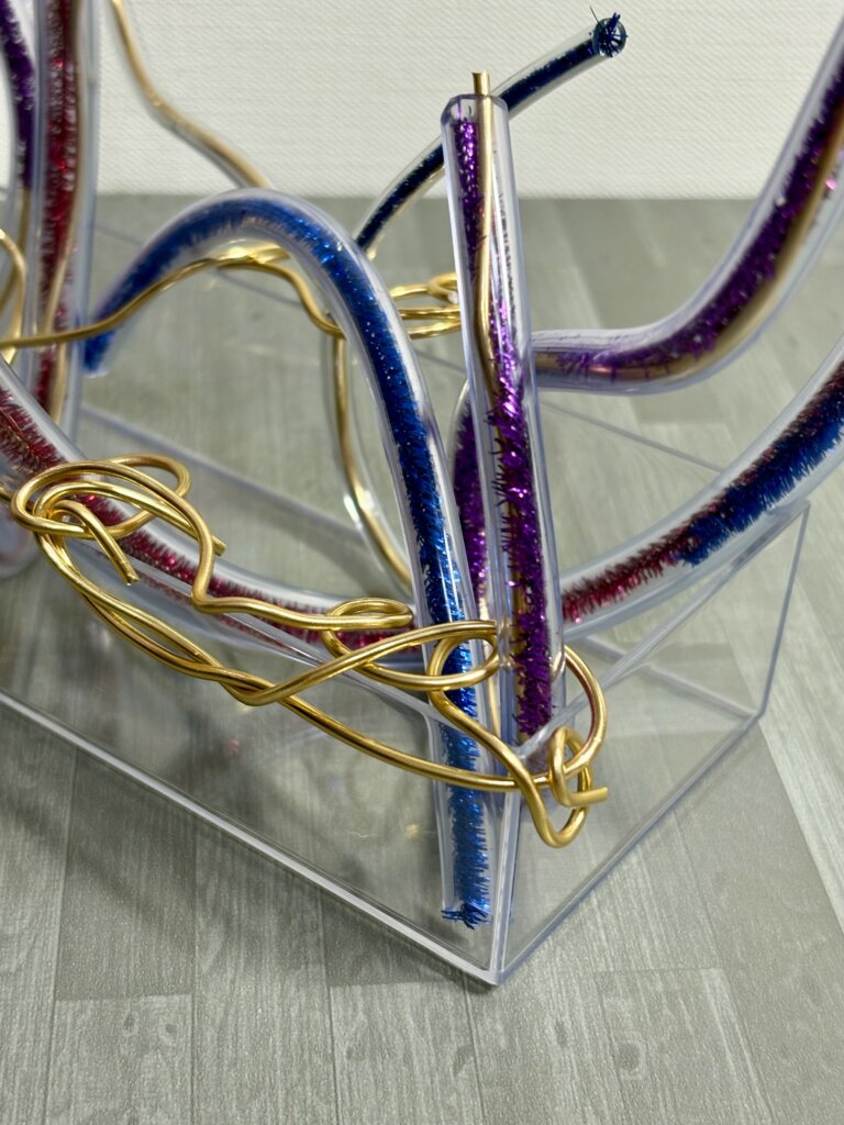 2)アルミワイヤでチューブ留めをつくります。チューブを通したり挟んだりするので、あまり細かく巻いたりしない方が留めるときに楽です。チューブを固定してから、細かいデザインをつけて整えるといいでしょう。