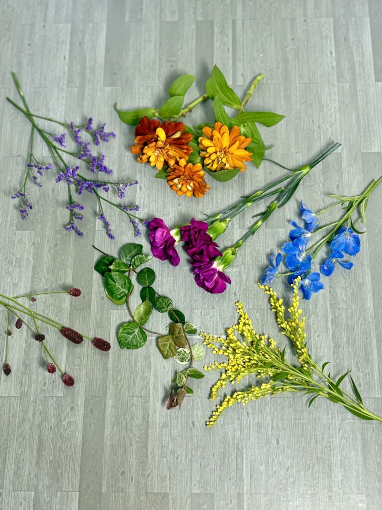 スターチス、ジニア、SPカーネーション、SPデルフィニウム、ソリダコ、ゴシキカズラ、ワレモコウ