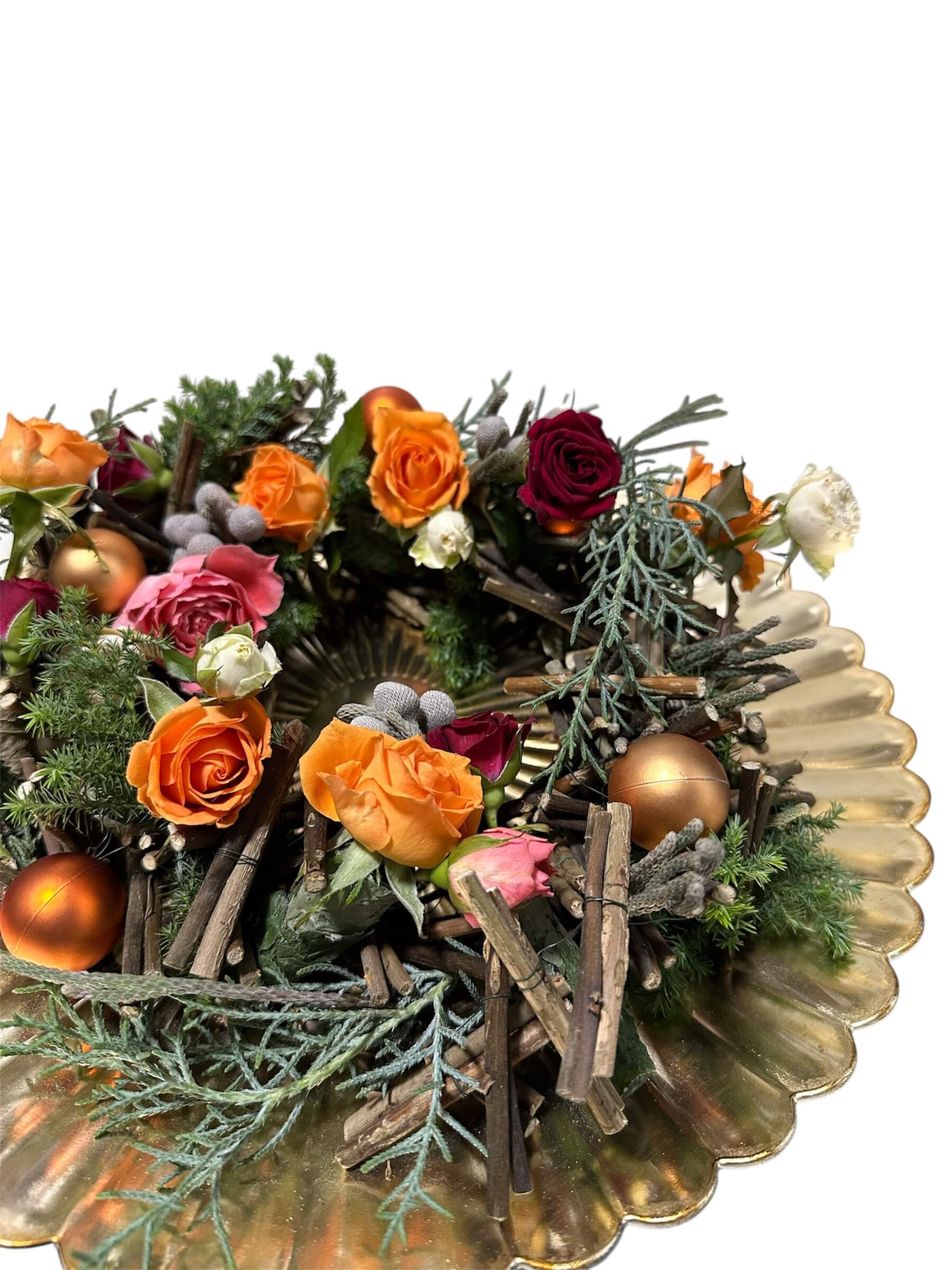 スプレーバラ(オレンジ、赤、白)、シルバーブロニア、ヒムロスギ、ブルーアイス
