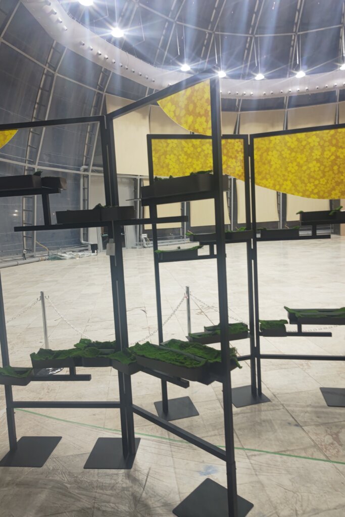 NFDは、3月12日(火)から日本国屋内展示を担当し、3月10日(土)より施工に取り掛かりました。土台の制作が始まり、灼熱の太陽の下、ドーム型に作られたビニールハウスのようなパビリオンの一角で作業を進めました。熱中症と戦いながらの作業となりました。