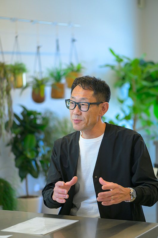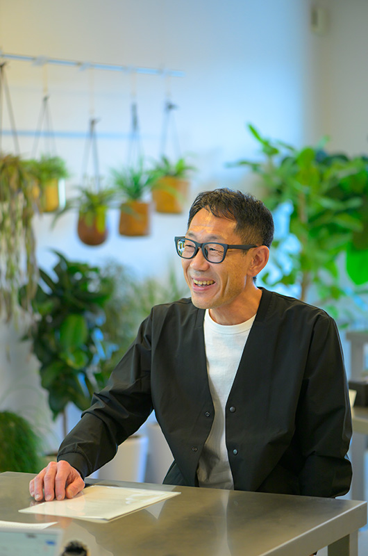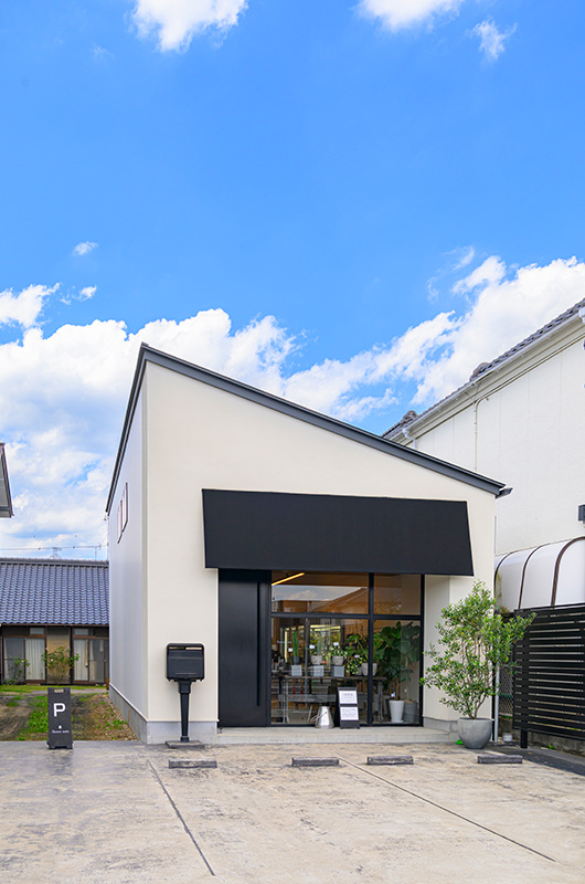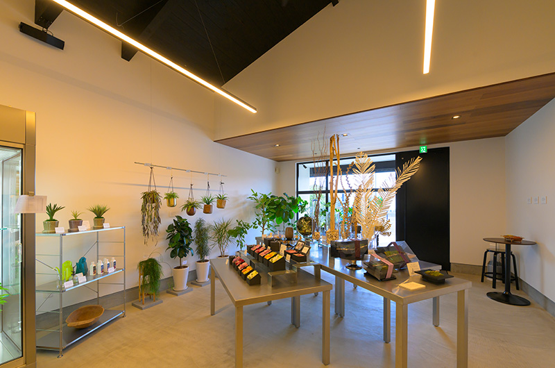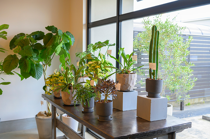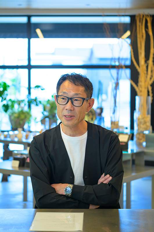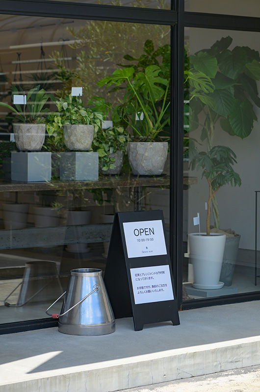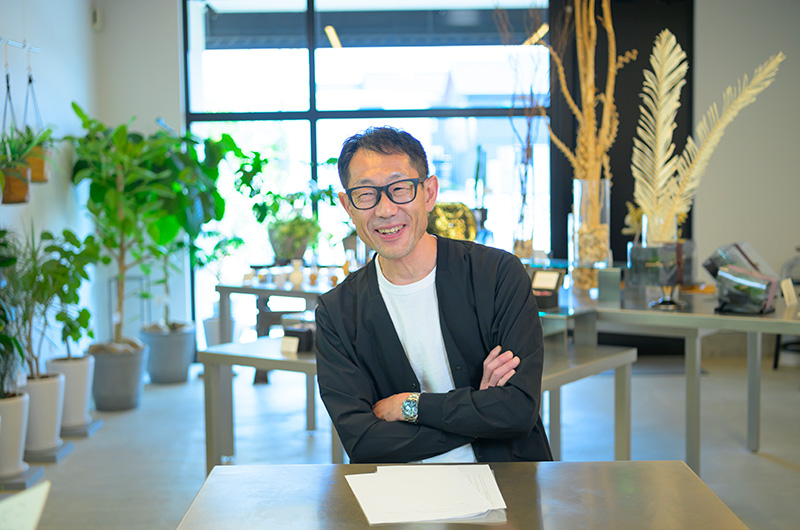 スタイリッシュな黒い外観、店内もアーティストのアトリエのような雰囲気で、大きな観葉植物の鉢やさまざまな花器、ブリザーブドフラワーボックスなどが整然と並び、奥には厳選された切り花が収納されたガラスケースが置かれています。シンプルでありながら、計算された美しさを感じさせるこの店のオーナーこそ、伊東慶直さん。『フラワーノート』は、まるでご自身の作品世界のような佇まいです。