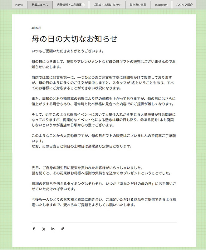同じ意味で、実は今年から「母の日」はやめました。毎年カーネーションを何100本も仕入れ、しかも足りないといけないからと余分に用意すると、当然余りますよね。それは売る側が消費者を煽って、無駄を出しているようにしか思えなくなってしまって……。きっかけになったのが、花 束を求めに来られた女性のお客さまとの会話です。「今日は私の誕生日なんです」といわれて、ご自分のためなのかと話を聞いたら、「母に感謝の気持ちを込めてプレゼントするんです」と返されて……。こういう感謝の形があるのか!と、本気で感動しました。何も5月の第2日曜日に世の中全部揃ってやる必要はない、それぞれの「母の日」があっていい、と考えたのです。思い切って今年から、うちの店はそういうスタイルでいきますと、ホームページにも趣旨を掲載。幸いお客さまからの評判も良くて、この先も続けるつもりです。