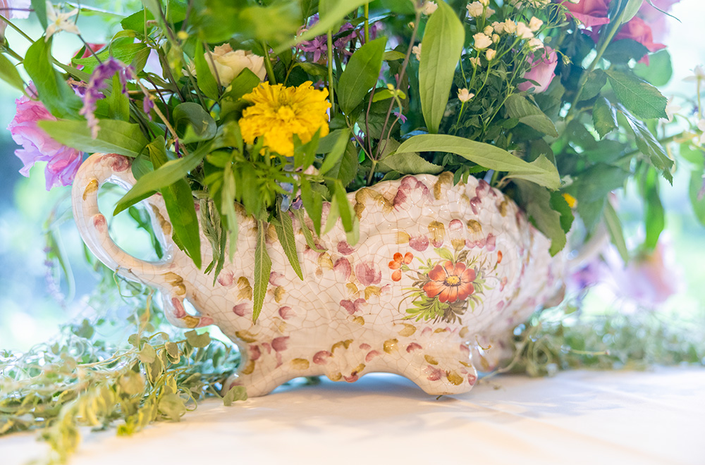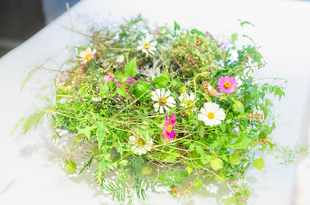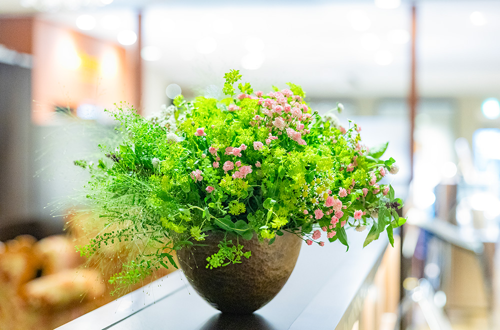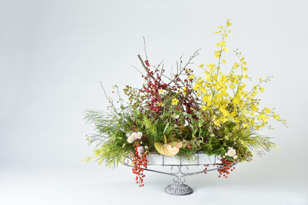 フラワーデザインというより、‟花のデザイン”という言葉が好きなんです。私自身が制作する作品に対するこだわりは、フォーカルポイントに挿しましたというような感じが好きではないので、検定試験のような花はつくりません。寸法が決められ吸水フォームに挿すと、そこに力が入ってしまうけれど、自然界の花はどんな花でも優しいんです。南アフリカに行った時に、バンクシアのような強い花でも、自然に咲いているのは本当に優しい風情でした。ですから私は、自然の花のように、というのを一番大事にしています。 想い出に残っている言葉で、3人の方から同じように褒めていただいたんです。西日本のカルチャーセンターでお世話になった事務局長の方から「教え方に哲学がある、将来が楽しみだ」と。そして、アスマン先生とポール先生も「副島の作品には哲学がある」「あなたは緑の目を持っています」と言ってくださいました。すごい褒め言葉だと思うんですね。とても嬉しくて、この言葉は私の宝物です。