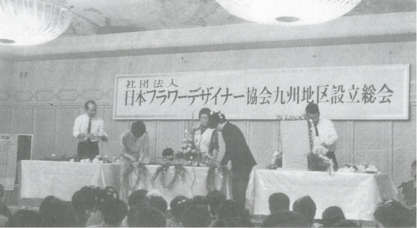 そもそも日本フラワーデザイナー協会は、フラワーデザイナーという存在が認知されてきたので、六本木のゴトウ花店(ゴトウフローリスト)の鈴木会長が提唱してつくられた、お花屋さんが中心の組織でした。当時の私 はそのことを知らなくて、創立メンバーとして参加。だから本当に、草分けの一人なんです。翌43年の九州地区支部委員を皮切りに、50年から九州支部長を務め、52年に理事に就任。2期4年間を理事、続いて11期22年間(現在は改正)を常任理事、そして平成15年よりは副理事長を務めました。