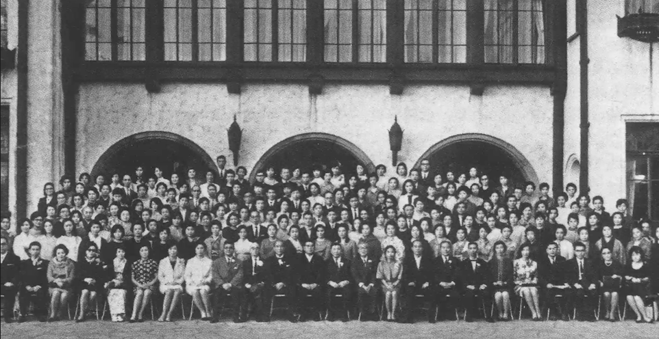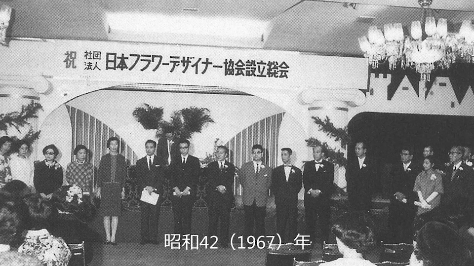 日本フラワーデザイナー協会が創立したのも、昭和42年のことです。赤坂プリンスホテルに、400人近くの方たちが集まって発足を祝いました。その時に撮った写真が、創立50周年記念誌にも掲載されていますが、これは私が提供したんです。懐かしいですね。