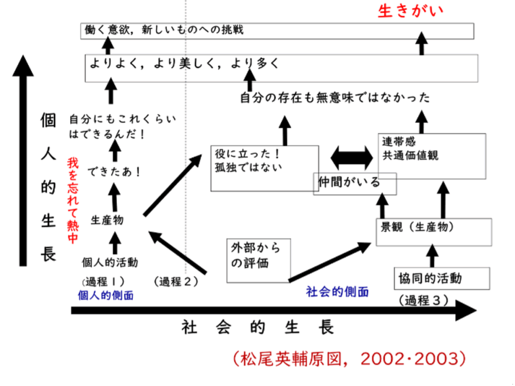 身体障害の療法としての園芸療法により、生きていく上で普通に必要とされるあらゆる心身の機能を使うことになります。つまり、自然と達成感や満足感をもたらしたり、存在価値や自信や意欲を生み出したり再獲得できたりすることでしょう。そのような際に個人の効用に加えて、社会的効用が加味されることが多いのも園芸療法の特徴でしょう。 1950年代のアメリカのフィラデルフィアでは、‘フィラデルフィアグリーン’とのちに称される「窓辺に植物を飾ることが、それを実践する人たち自身とその環境変える働きをもつ」ことを証明し園芸により犯罪率は明らかに低下しました。その事実は、「園芸によるまちづくり推進運動」の先駆けとなり、その後も精神医学者のLewiseらは園芸の心理的影響について研究を進め、癒し、やすらぎ、落ち着きだけでなく自信ももたらすことを発表しました(Lewis, C. 1996. Green nature / human nature – The meaning of p1ants in our 1ives. University of Illinois Press. Urbana and Chicago. USA;松尾英輔.農業および園芸88巻1号p.32-42.)。これは、個人個人の園芸活動が街中に影響を与え、街全体を癒し犯罪率を低下させる力を発揮したものでしょう。つまり、園芸療法で用いる「育てる行為」は、個人の多面的な成長も促すことができるうえに、周囲との良好な関係性も構築できることで社会的な成長ももたらすことが期待されます(以下の図参照)。結果として、療法を必要とする精神的に後ろ向きな患者さんと、無理なく自然な形で生きがいを共有させて頂くことが期待できるのです。