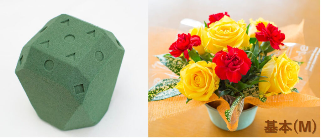 私たちが実践している脳機能の回復訓練では、あらかじめ決められた花材を見本通りに、指定された箇所に挿していきます。具体的には、〇や△の印がつけられた吸水フォームに花材を挿し込んでいきます(写真左、特許5201552号)。〇印にはガーベラ、△印にはカーネーションという具合に花材に対応した印が決められています。また、花材を斜め45°に差し込んで欲しい場合は印が付けられたスポンジ面が45°にカットされているため、利用者は自然と花材を斜めに挿すことができるのです。利用者は順序良く、各印に決められた花材を挿し込んでいくだけで形の整ったフラワーアレンジメントを完成させることができます(写真右)。私たちは、このようなフラワーアレンジメント法による脳機能回復訓練をSFAプログラムと名付けました。SFAはStructured Floral Arrangement Programの略です。自由な発想でフラワーアレンジメントを作成するのではなく、構造的に決められた手順で作成するという意味が含まれています。