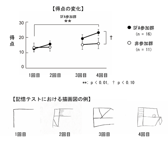 SFAプログラムに参加した16名の記憶力テストは、平均得点が12.7点(1回目)から23.3点(4回目)へと有意に向上し、4回目の得点は非SFA参加者(11名)の平均点と比べると4割以上高い値でした(図上)。重度の記憶障害の方もプログラムが進むにつれて思い出せる部分が増えていきました (図下)。SFAプログラムの特徴は、フラワーアレンジメントという楽しい作業を通して、記憶力のような認知機能を向上させる点です。