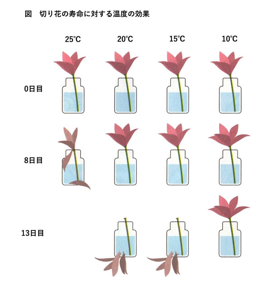 たとえば、同じ日に花屋さんで買ってきた開いたばかりの花を、光の強さや湿度は同じ条件で、温度が、10℃、15℃、20℃、25℃とそれぞれ異なる部屋に置いて比較します。すると、温度が低い部屋に置かれたものほど、イキイキと元気で長持ちします(下図参照)。 ですから、切り花は、冬なら暖房していない部屋に置けば、暖房している部屋に置かれた場合より長持ちします。また、夏なら、冷房している部屋に置かれた切り花は、冷房していない部屋に置かれたものより長持ちします。