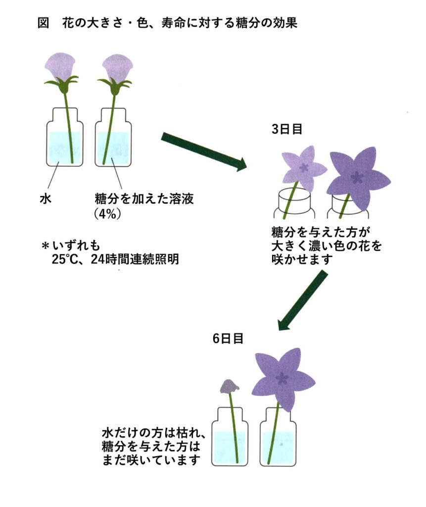 下図は、キキョウの実験結果を示したものです。糖を4%の濃度になるように加えた溶液では、大きな濃いきれいな色の花が咲きます。また、6日目には、水だけの方の切り花は枯れていますが、糖分を加えた溶液の方は、まだきれいに咲いています。